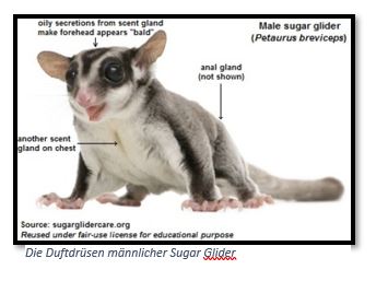 Zeugungsreife Männchen haben außerdem zwei auffällige Duftdrüsen, die eine auf der Stirn und die andere im Bereich der Brust (es gibt weitere Duftdrüsen, aber diese zwei sind die hervorstechendsten). Die Duftdrüsen sondern ein oranges/braunes, öliges Sekret aus, mit dem sie ihr Revier, andere Glider oder auch ihre Menschen markieren.
