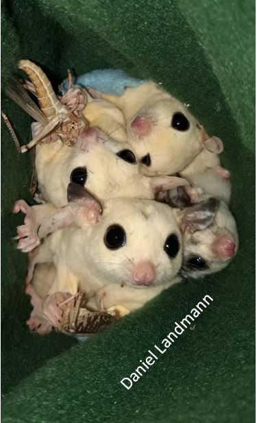 Eine Fütterung von Lebendfutter über einen längeren Zeitraum „auf gut Glück“ und Bauchgefühl hat in einigen Fällen lebensbedrohlichen Situationen geführt. - Niemals sollten Futtertiere aus der freien Natur den Weg in die Voliere finden. Dies ist nicht nur gesetzlich untersagt, sondern bringt auch das Risiko mit sich, einen Exo- oder Endoparasiten-Befall bei den Sugar Glidern zu riskieren.